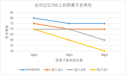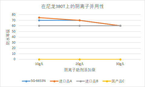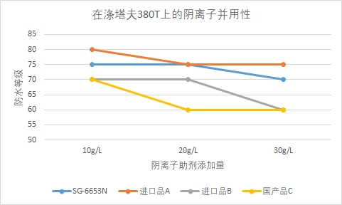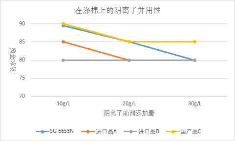 结论:SG-6653N的阴离子助剂并用性相近于进口品A,优于进口品B和国产品C。
