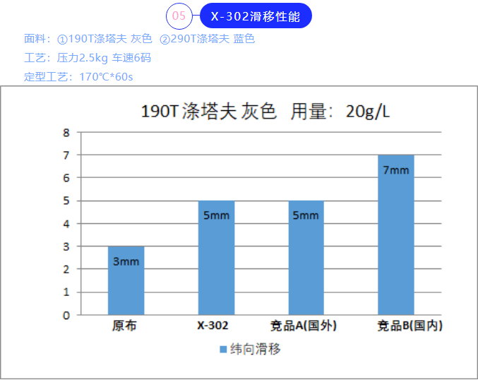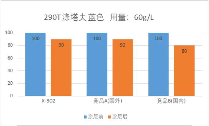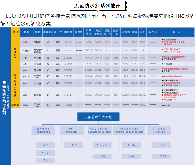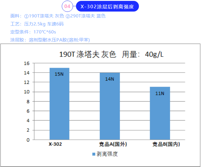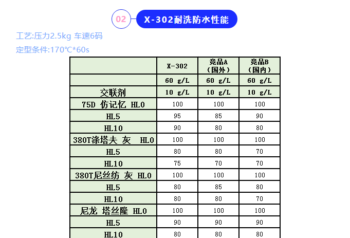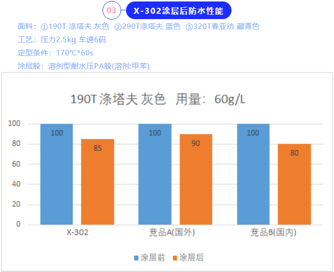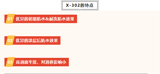 伞布、帐篷布等一般采用无氟防水加工后再进行涂层,较难获得良好的防水效果和剥离强度,为了改善和解决这一问题,福可新材料(上海)有限公司通过聚合研发和应用测试,开发了涂层专用无氟防水剂 X-302。